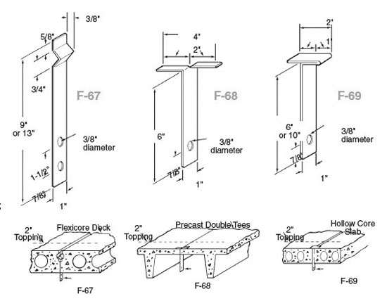 The Dayton Superior F67 Ceiling Hanger is designed for Flexicore deck slabs. Two sizes of ceiling hangers accommodate all five of the deck slabs. The 13" ceiling hanger fits the 10" and 12" deck slabs. The F67 hanger is placed between the slabs before keyways are grouted and topping placed. The Dayton Superior F68 Ceiling Hanger is commonly used with double tees. The hanger is placed between the tees and used to hang ceilings, utilities, etc. The wide “T” of the hanger provides a large bearing area. 6" length is standard; other lengths are available on request.